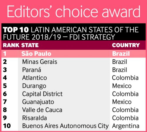 El ranking, denominado ‘Latin American States of the Future 2018/19’, donde 171 regiones participaron en diferentes categorías, es elaborado por FDI Intelligence, una de las divisiones de inteligencia más importantes del mundo en materia económica, que hace parte del reconocido diario británico Financial Times.
