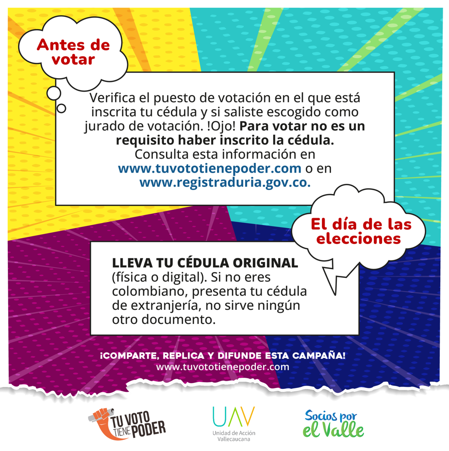 #TuVotoTienePoder NO ES una campaña de proselitismo político; por lo tanto, su mensaje es neutral, no apoya partidos, movimientos, personas o grupos de ciudadanos. La invitación a todos los vallecaucanos es a que compartan los mensajes a través de sus redes sociales y se sumen a esta estrategia para el fortalecimiento de la democracia.
